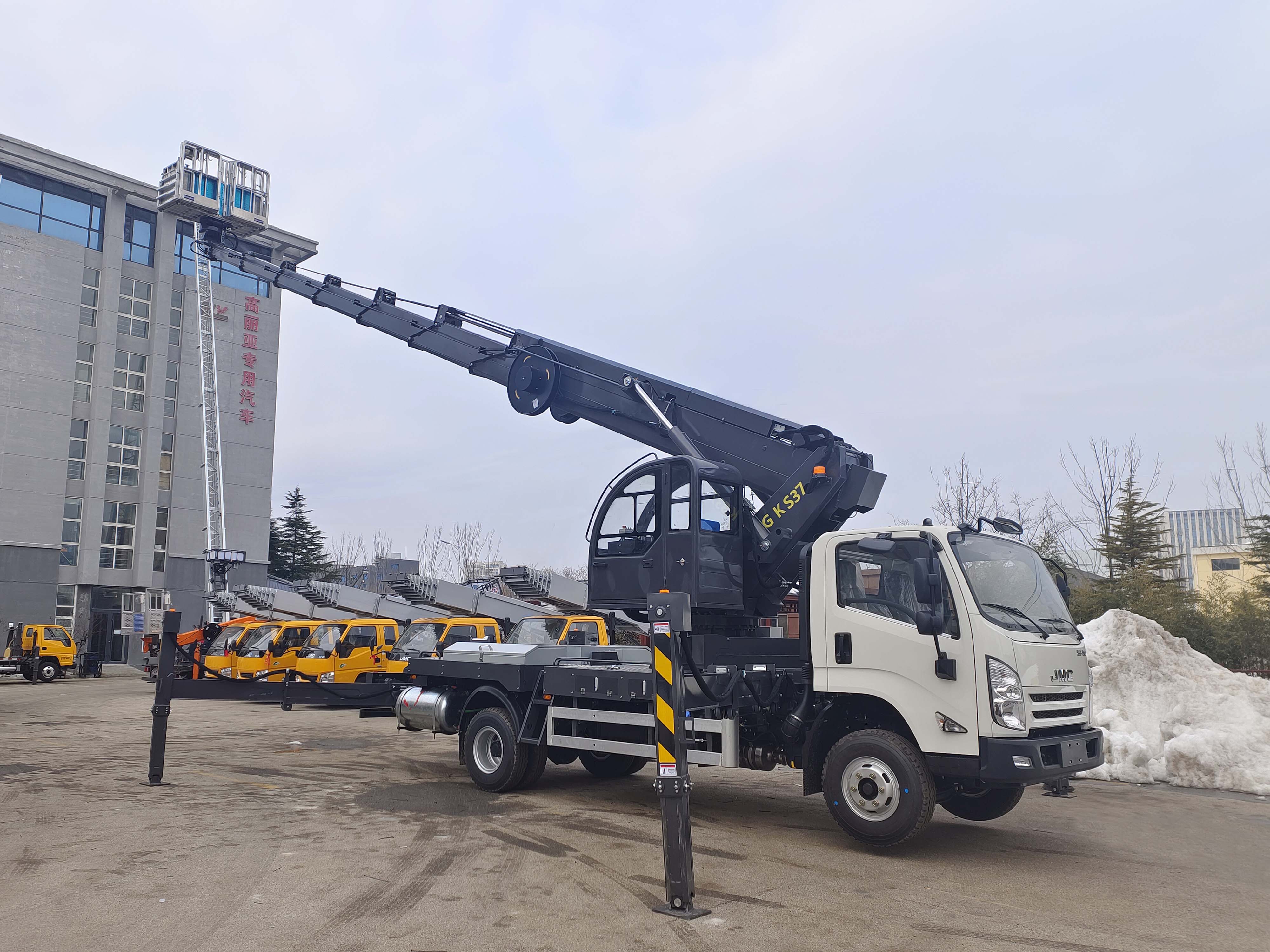 VGL5111JGKGLY1型高空作业车作业高度38m,作业幅度23m,转台360°全回转。操作简单,响应灵敏,作业范围大。本车采用七节臂,同步伸缩,无级调速,性能优越;高强度航空铝材工作平台,电镀防滑走台板,坚固耐用、美观大气。